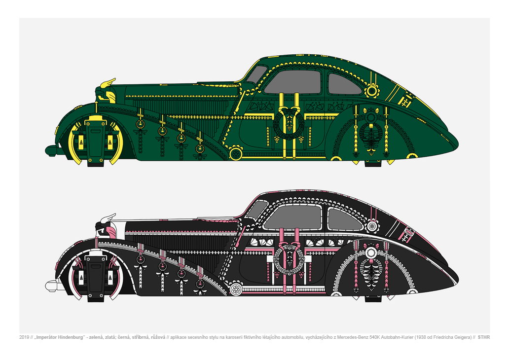 | Barevný design (studie) pro fiktivní létající automobil podle karoserie Mercedes-Benz 540K Autobahn Kurier z roku 1938 Friedricha Geigera (1907 až 1996). Horní kombinace - klasická secesní tmavě zelená a zlatá. Spodní kombinace: černá, stříbrná (nerez ocel) a růžové zlato (eventuálně měď). |
