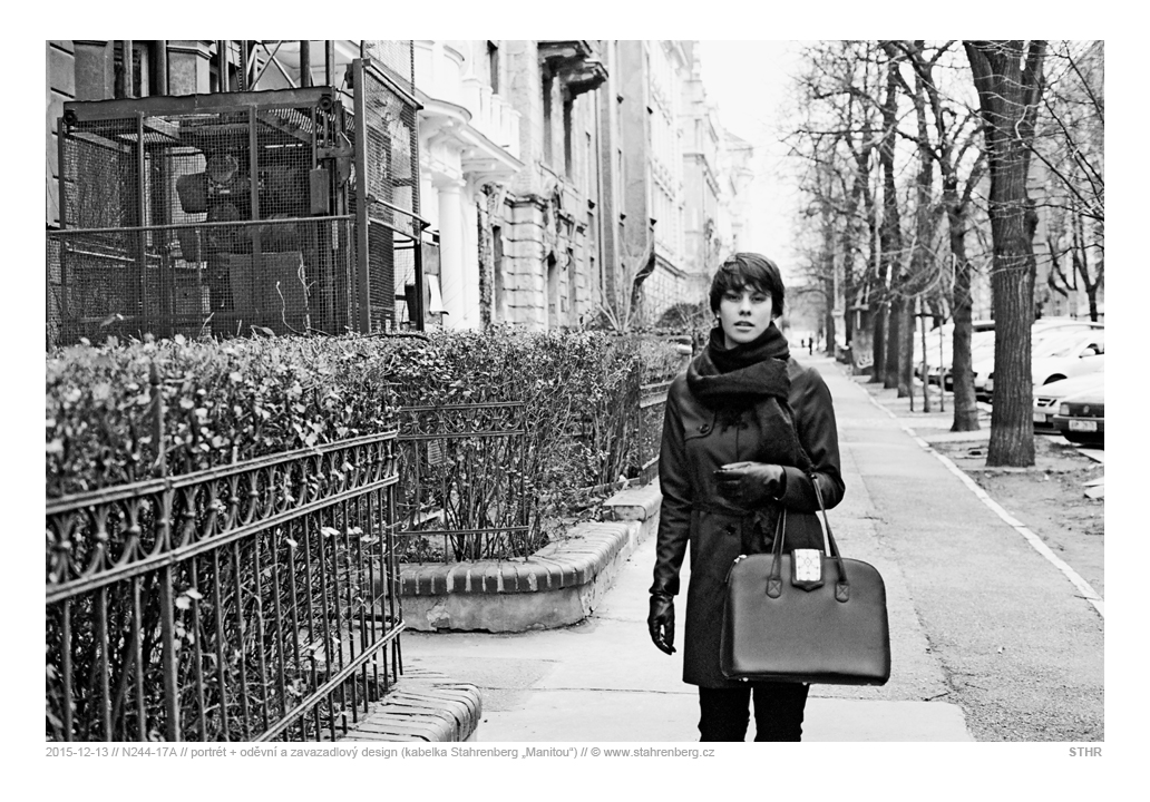 Portrét, oděvní a zavazadlový design - první kabelka Stahrenberg ("Manitou" s ozdobnou přezkou na motivy indiánských vzorů). Kinofilmový fotoaparát Canon AE-1 Program, objektiv: Canon FD 50 mm, 1:1.4, materiál: Kodak. Sken a digitální úprava. |