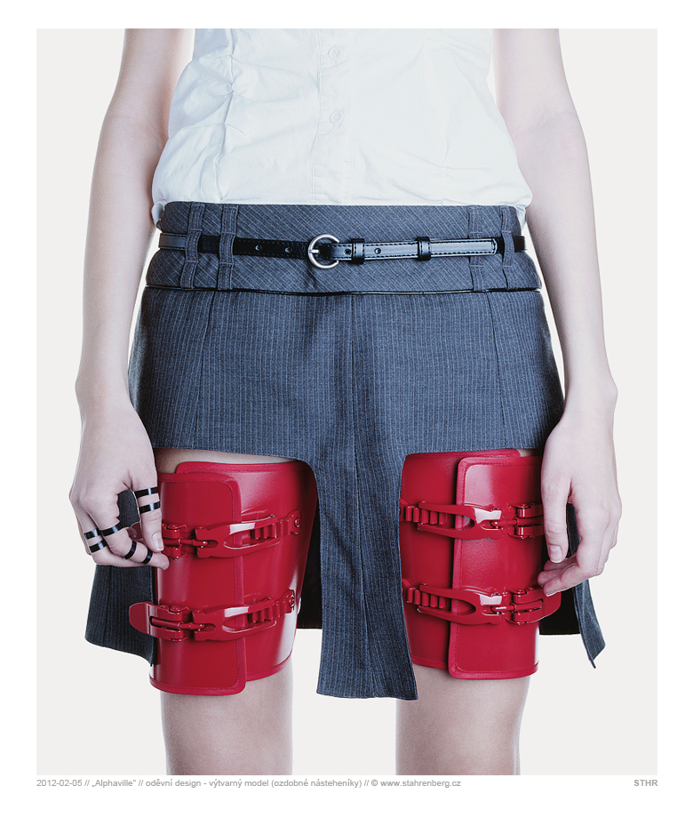 Oděvní design - výtvarný model s červenými násteheníky. Velkoformátový fotoaparát Plaubel 4x5, kazety: Lisco 4x5, objektiv: Rodenstock APO Sironar N 150/5.6, materiál: Kodak. Sken a digitální úprava.