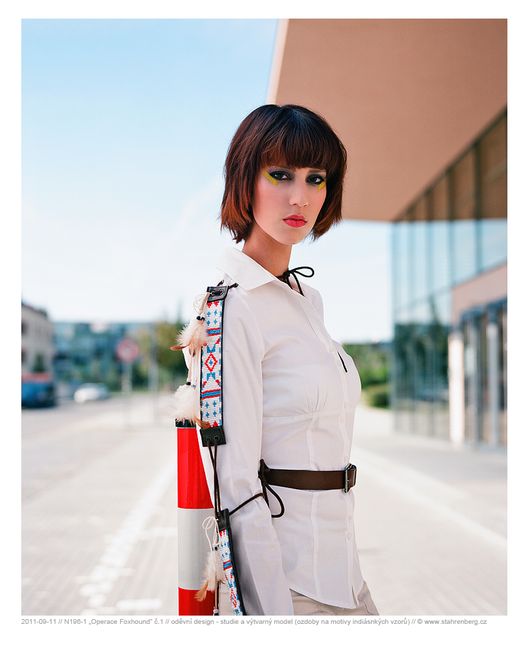Oděvní design - výtvarný model s ozdobou paže na indiánské motivy. Středoformátový fotoaparát Mamiya RB67 Pro SD, objektiv: Mamiya KL90/3.5L, materiál: Kodak. Sken a digitální úprava (fotografie N196-1).