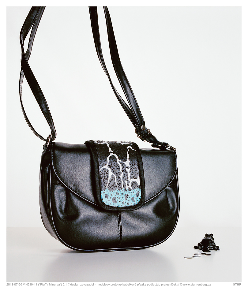 Zavazadlový design - modelový prototyp ozdobné přezky na motivy vzhledu ab pralesniček. Středoformátový fotoaparát Mamiya RB67 Pro SD, objektiv: Mamiya KL4.5/180L-A, materiál: Kodak. Sken a digitální úprava.