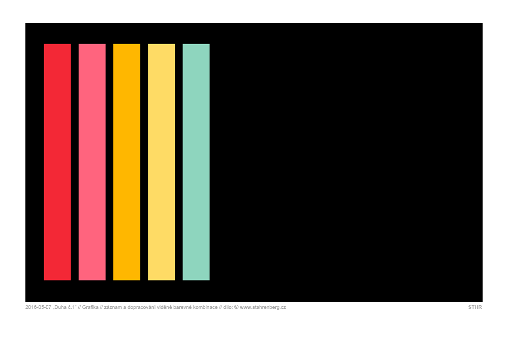Fenomén různobarevných proužků blízko u sebe, který je v přírodě pozorovatelný jako duha a v oděvním designu většinou na sportovním oblečení, mě v oboru estetiky/grafiky zaujal a i proto si myslím (už si to přesně nepamatuju), že v případě mého díla se jedná o záznam, nebo dopracování barevné kombinace (nebo její části), kterou jsem asi někde viděl. |