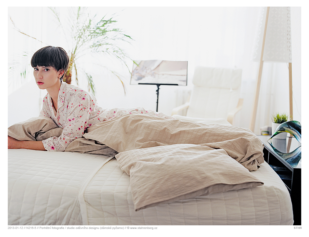 Portrétní fotografie / studie oděvního designu - dámské pyžamo. Středoformátový fotoaparát Mamiya RB67 Pro SD, objektiv: Mamiya KL4.5/180L-A, materiál: Kodak. Sken a digitální úprava. Otevřená kniha na notovém stojanu v pozadí - Franco Pace, "Giro d´aria". |