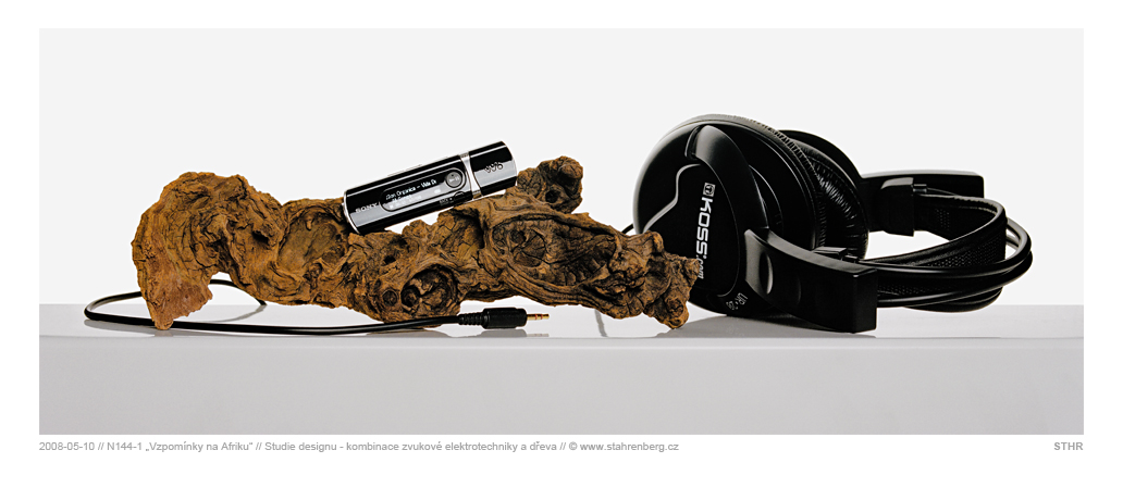Studie designu - kombinace zvukové elektrotechniky a dřeva. Středoformátový fotoaparát Mamiya RB67 Pro SD, objektiv: Mamiya KL90/3.5L, materiál: Kodak. Sken a digitální úprava.