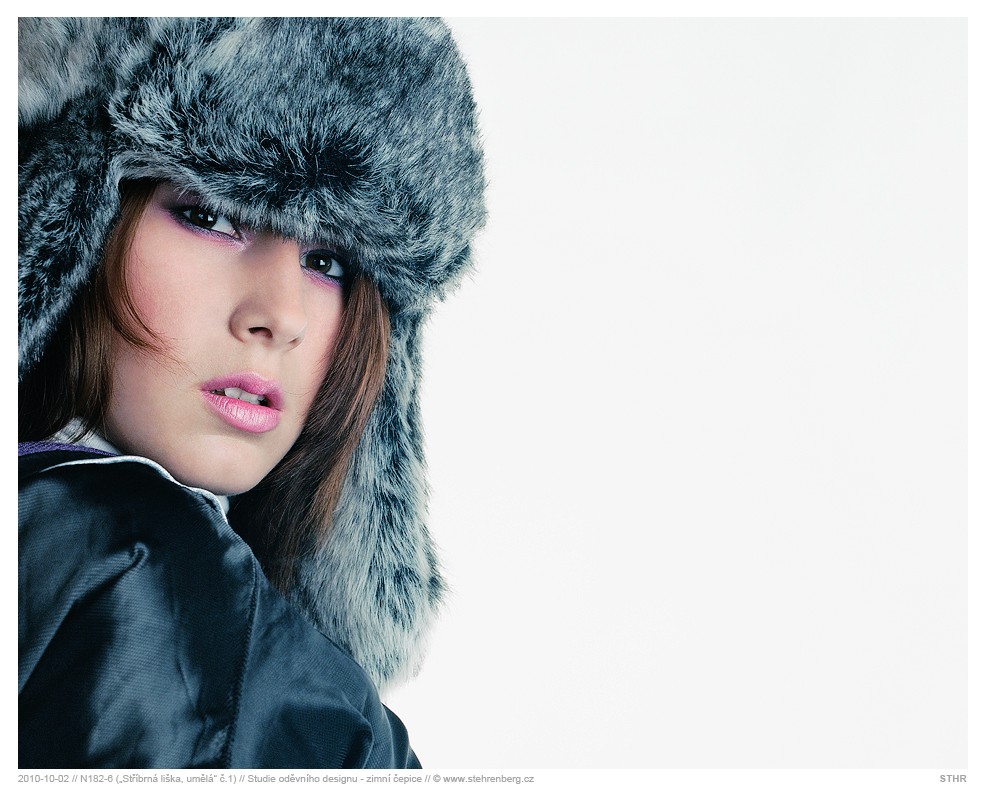 Studie oděvního designu - zimní čepice. Středoformátový fotoaparát Mamiya RB67 Pro SD, objektiv: Mamiya KL90/3.5L, materiál: Kodak. Sken a digitální úprava.