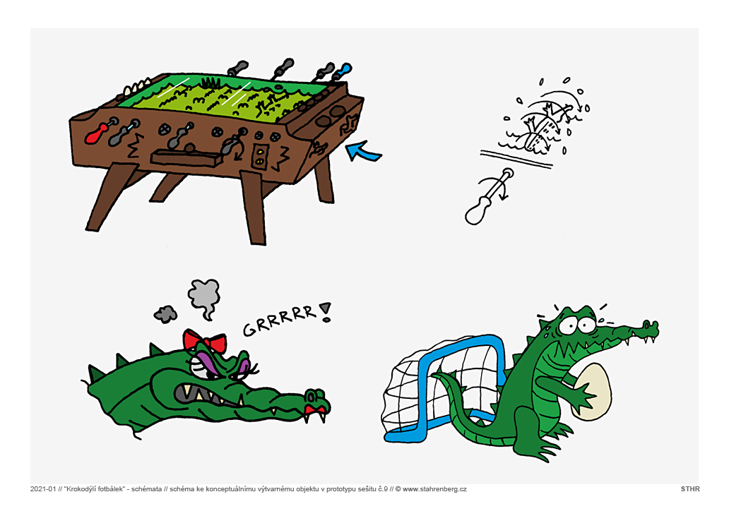 Schéma ke stejnojmennému konceptuálnímu výtvarnému objektu ze sešitu č.9, použité zatím pro jeho prototyp. Jednalo by se o napodobeninu klasického hospodského fotbálku, pracujícího ale se zvláštním principem rotování krokodýlů kolem jejich podélné osy ve vodní nádrži a s míčky ve tvaru vajíček. Objekt by doprovázely také kresby, znázorňující přistižení krokodýlích samců při fotbalové hře s vajíčky, která měli hlídat, zatímco samice šly na "kosmetiku" atp. (zřejmě předčasný příchod a opětovné provinění samců). Modrá šipka znázorňuje jedno z možných umístění tohoto výjevu. |