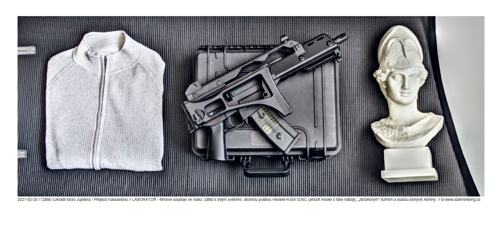 Zvláštnost zajímavého prvku akčních filmů - boje ve vlaku. Zátiší "volně na motivy" názvu a obsahu filmů "Přejezd Kassandra" (r. George P. Cosmatos, 1976) a "Ukradli torzo Jupitera" (r. Philippe de Broca, 1980) - zátiší s bílým svetrem, útočnou puškou Heckler-Koch G36C (airsoft model s fake náboji "v" zásobníku), "zbraňovým" kufrem a bustou bohyně Athény. |